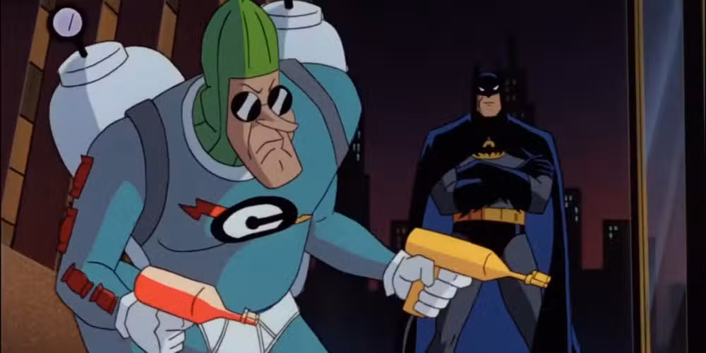Creado originalmente para comedia, Condiment King debutó en Batman: TAS “Make ‘Em Laugh”, donde Joker hipnotiza a los comediantes para que se conviertan en villanos absurdos. Armado con pistolas de ketchup y mostaza, estaba pura parodiaburlándose del exceso de galería de pícaros de Batman. A pesar de su tontería, la creatividad del personaje se hizo apreciada por su autoconciencia.