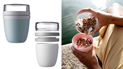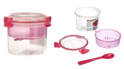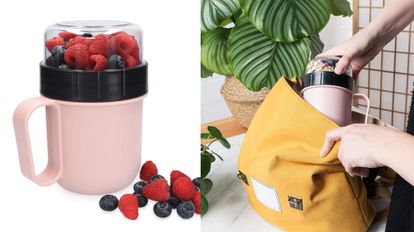 Si eres de los que prefiere tomar el desayuno nada más llegar a la oficina, este accesorio es lo que andas buscando para hacerlo con comodidad. Muy útil, sobre todo, para guardar yogur o líquidos como zumo o leche y luego mezclarlos con pequeños trozos de fruta o cereales, mediante su bandeja extraíble. A la venta en color rosa y azul.