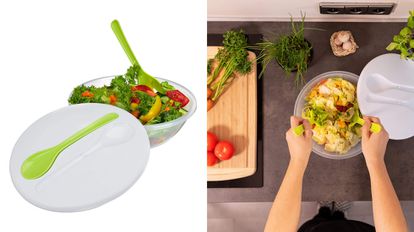 Las ensaladas, para disfrutar de todos sus nutrientes, deben guardarse en lugares adecuados para ello. Como es el caso de este bol fabricado en plástico y tapa hermética. Esta función hermética está pensada para preservar cada uno de los ingredientes frescos y con la mejor de sus texturas. El material empleado es inicuo y el tamaño de la ensaladera resulta perfecto para su transporte: 9,5 x 28 cm. Incluye cubiertos de plástico reutilizables que se pueden encajar en la tapa.