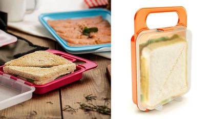 Otra opción es hacernos con un porta sándwiches como el de la imagen. Fabricado en plástico rígido, dispone de una asa amplia y de un cierre fácil. Con un tamaño de 14 x 4 x 18 cm, nos resultará muy cómodo llevarlo en la mano y guardarlo en la mochila sin miedo a que se estropee la comida. Además, del consabido ahorro en papel de aluminio. A la venta en color turquesa, naranja, rosa y lima.
