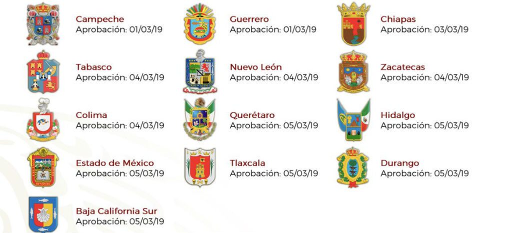 Dichos Congresos son de los estados de Guerrero, Tabasco, Campeche, Chiapas, Nuevo León, Colima, Zacatecas, Hidalgo, Querétaro, Estado de México, Durango, Baja California Sur y Tlaxcala.