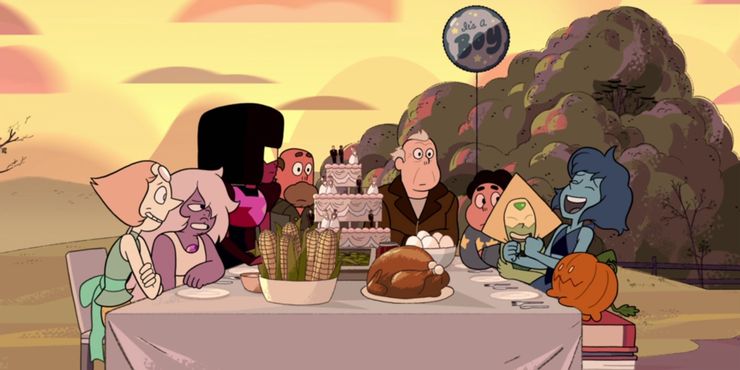 El episodio “Gem Harvest” en Steven Universe no está etiquetado como un episodio de Acción de Gracias, pero bien podría ser como se estrenó el 17 de noviembre de 2016 y tiene una historia inspirada en Acción de Gracias. La premisa principal de la historia es que Steven visita el granero y conoce a un personaje inesperado.