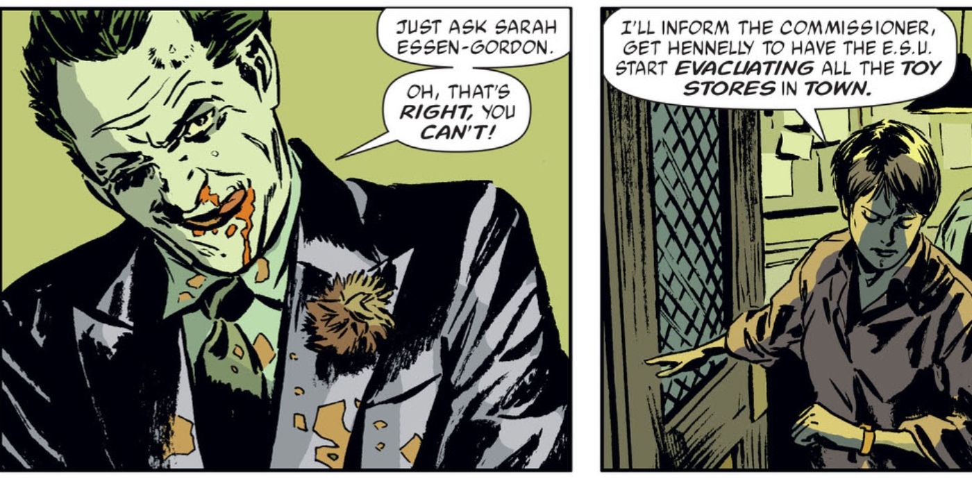 En Ciudad Gótica #15 por Ed Brubaker, Greg Rucka y Michael Lark, el Joker es interrogado y Maggie Sawyer pregunta qué pasa con el Joker y los niños. Sin perder el ritmo, Joker responde “A todo payaso le encantan los niños, Capitán. Pregúntale a Sarah Essen-Gordon. ¡Ah, es cierto, no puedes!”. Años después de asesinar a la esposa de Jim Gordon, el Joker no puede evitar hacer una broma sobre el dolor que causó.