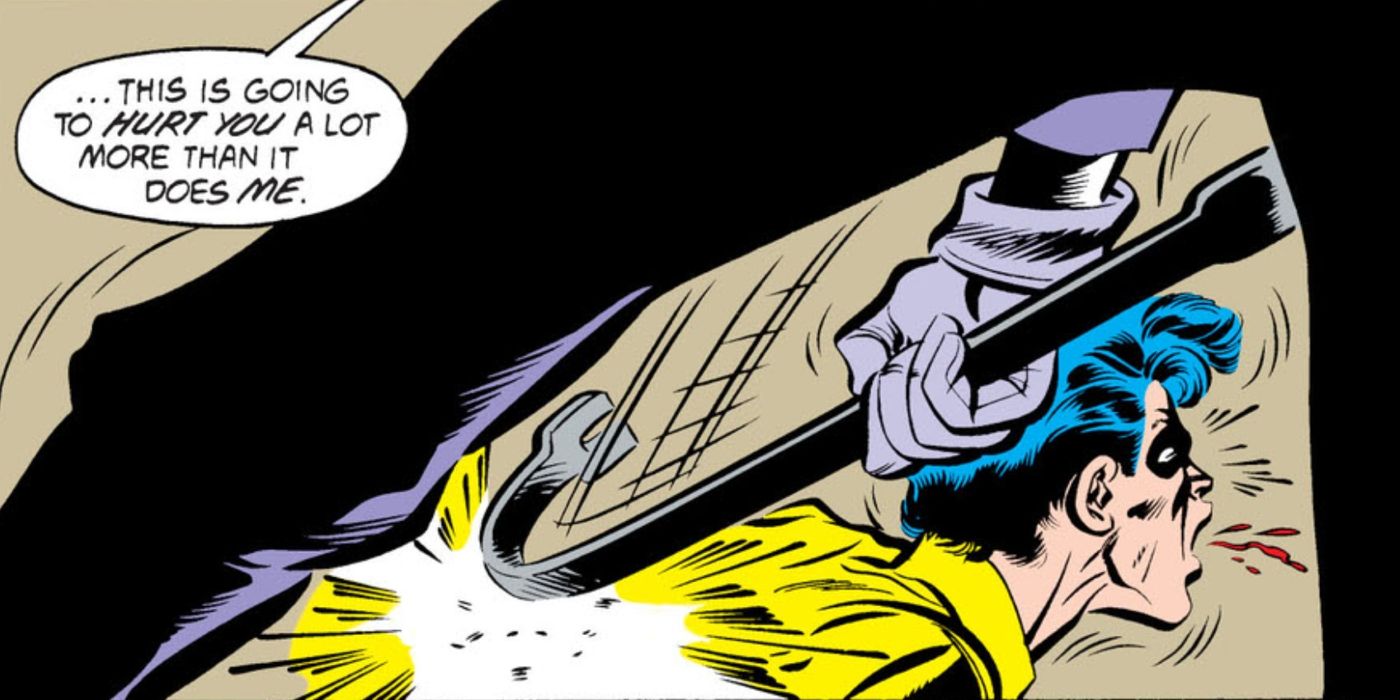 El Joker asesinó a Jason Todd en Batman #427 por Jim Starlin y Jim Aparo. Pero antes de hacer estallar a Robin, Joker lo golpeó violentamente con una palanca y le dijo: “Esto te va a doler mucho más que a mí.”. El Joker ha hecho muchas cosas retorcidas en su vida. Pero esta golpiza salvaje y la cita enfermiza hacen de este evento uno de los peores del Joker.