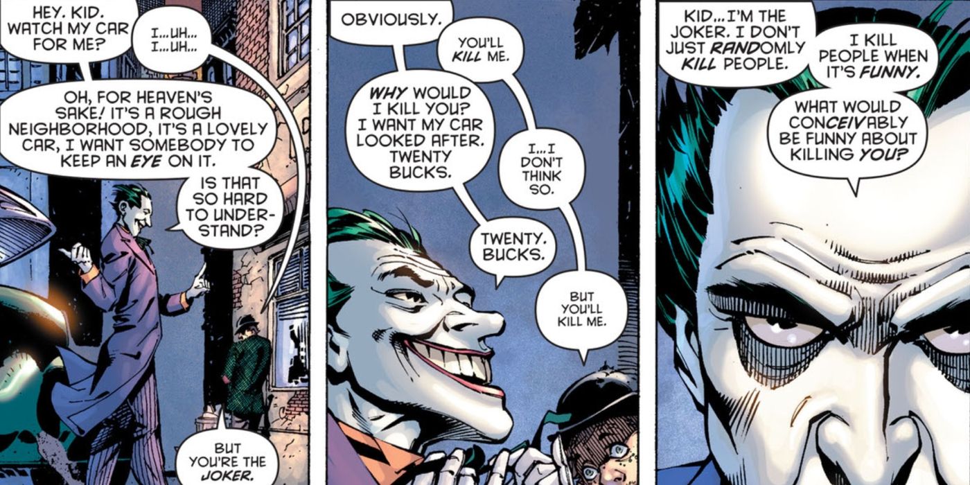 En “Whatever Happened to the Caped Crusader” de Neil Gaiman y Andy Kubert, el Joker le pide a un lugareño que vigile su auto. Temiendo que el Joker lo mate, el local dice que no. Pero como dice el Joker: “Mato cuando es gracioso. ¿Qué sería posiblemente divertido de matarte?”. Esta línea recuerda a los lectores que existe un método particular para la locura del Joker.