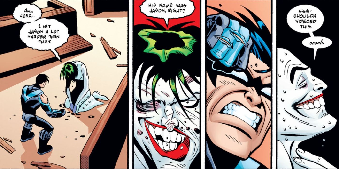 En Joker: Última risa #6 Por Chuck Dixon y Rick Burchett, Nightwing desata su furia contra el Arlequín del Odio, golpeando al villano una y otra vez. Sin embargo, Dick Grayson no le rompe el hueso de la risa al Joker mientras el payaso responde “Golpeé a Jason mucho más fuerte que eso. Su nombre era Jason, ¿verdad?”. Esta línea realmente muestra cuán consciente es el Joker del dolor que causó a la Bat-Familia cuando mató a Jason Todd.