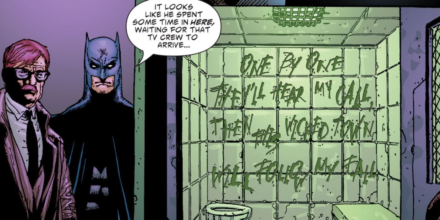 Durante el primer enfrentamiento entre el Joker y Batman en Batman: el hombre que ríe de Ed Brubaker y Doug Mahnke, Batman y Jim Gordon descubren un mensaje dejado por el villano: “Uno por uno, escucharán mi llamado, luego este malvado pueblo seguirá mi caída.”. Es inquietante y bastante poético, pero también un recordatorio escalofriante del deseo que tiene el Joker de arrastrar todo a la oscuridad con él.