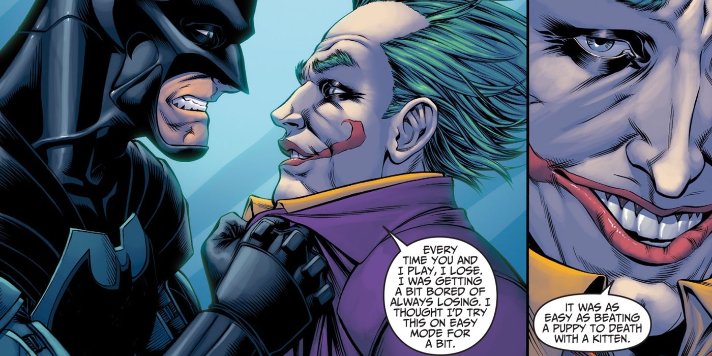 Cuando el Joker engañó a Superman para que matara a Lois Lane embarazada, no mostró ningún remordimiento. Injusticia: Dioses entre nosotros #4 por Tom Taylor y Mike S. Miller. Para él, orquestar el evento fue sorprendentemente fácil. “Era tan fácil como matar a golpes a un cachorro con un gatito.”. Esta inquietante línea revela que no hay límite para el Joker, ni ninguna profundidad despreciable en la que no se hunda.