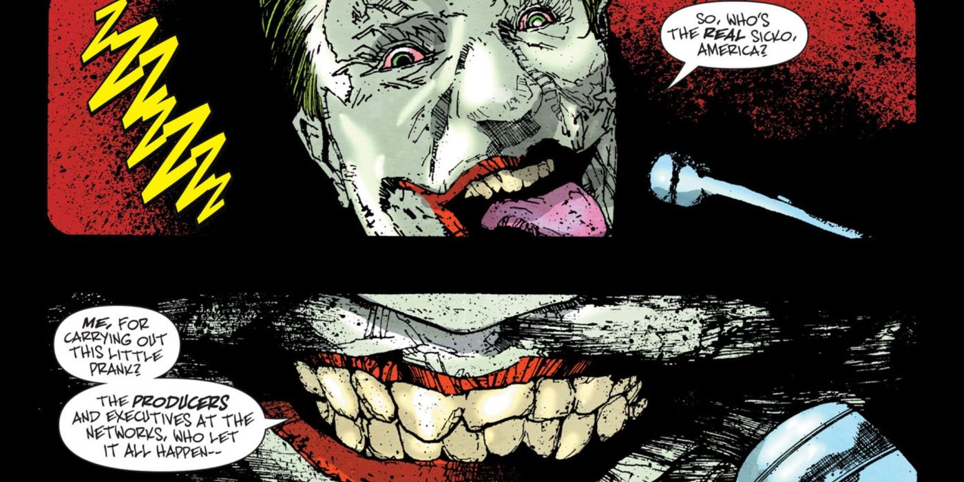 En Asilo del Joker: El Joker #1 Por Arvid Nelson y Alex Sanchez, el Joker se hace cargo de un programa de juegos y expone a un productor dispuesto a dejar que la gente muera por los ratings. Cerca del final de la transmisión, pregunta “Entonces, ¿quién es el verdadero psicópata, Estados Unidos?” y se burla del espectador por ver sus hazañas. Es espeluznante ver al Joker criticar a aquellos que disfrutan leyendo historias que involucran al psicópata asesino en masa.