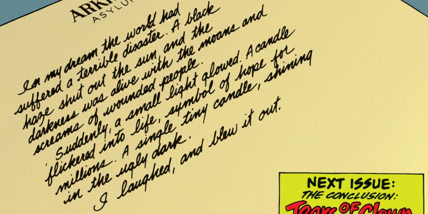 En Batman: La sombra del murciélago #37 Por Alan Grant y Barry Kitson, un documento del archivo de Joke relata un sueño particular que tuvo el Joker. En su sueño sobre la oscuridad dice: “Una vela cobró vida, símbolo de esperanza para millones. Una sola vela pequeña, que brilla en la oscuridad fea. Me reí y lo apagué.Esta línea encarna la naturaleza caótica del Joker y la cruel alegría que encuentra en su trabajo.