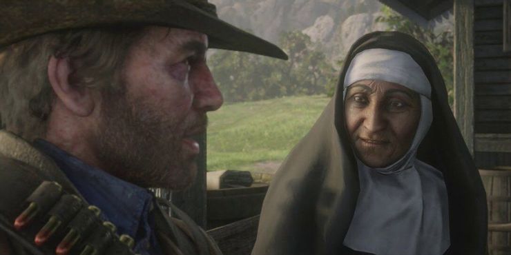 Volviendo a un Arthur más serio y sombrío, al final del juego, tiene una conversación en una estación de tren con una monja de antes en el juego y ofrece esta poderosa cita.