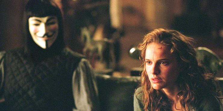Hugo Weaving interpreta a V con máscara de Guy Fawkes y Portman como su nuevo cómplice, Evey Hammond. Después de salvar a Evey de la policía secreta, V la entrena para ayudarlo en su misión.