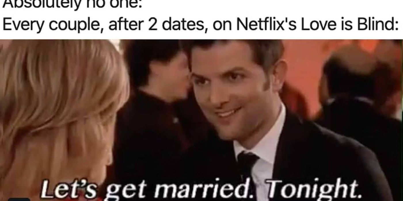 Antes de que este reality show de Netflix comenzara a ser tendencia, habría parecido increíble que las personas decidieran casarse después de simplemente hablar durante unos días. Nadie hubiera pensado que eso fuera posible, y mucho menos la idea detrás de un reality show que explotaría en popularidad. Este divertido meme resume perfectamente el punto del programa: dos personas “se conocen” y realmente deciden en un corto período que deberían casarse y volver cada temporada.