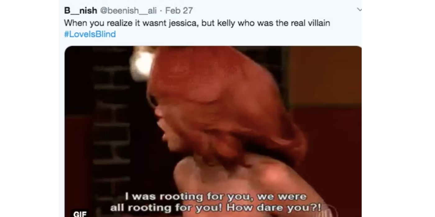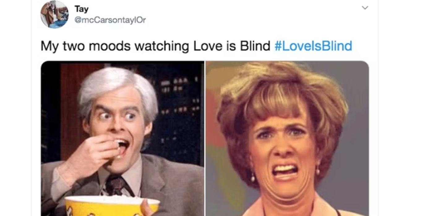 Esto muestra lo que es mirar El amor es ciego: en un momento, es entretenido y emocionante y no se puede dejar de mirar, y al minuto siguiente, es difícil de ver. El espectáculo despierta una gran cantidad de emociones y, por supuesto, expresiones faciales. Este meme no tiene precio.