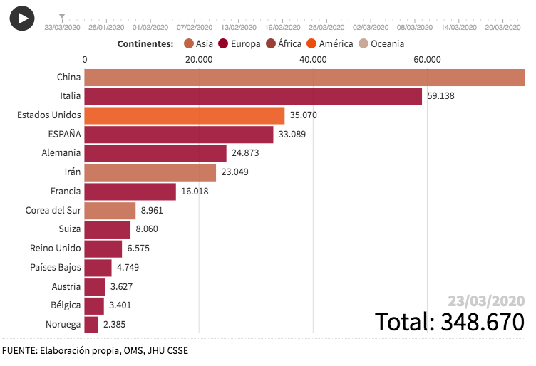 El nuevo coronavirus Covid-19 ha dejado más de 345 mil contagios en 178 países del mundo, la mayoría (más de 81.000) en China. Mientras tanto, la cifra de decesos supera los 15 mil y la de los recuperados, los 96 mil, apuntan dos mapas que se actualizan en tiempo real: el de RTVE en España y el de la Escuela de Ingeniería de la Universidad Johns Hopkins de Estados Unidos.