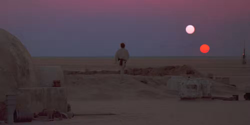 El disparo de Mark Hamill como el joven Luke Skywalker Mirando al cielo con los dos soles de los soles mientras la última luz del día desaparece lentamente Sigue siendo una de las tomas más esperanzadoras en la historia cinematográfica, elevadas por el puntaje icónico de John Williams y el bloqueo del DOP Gilbert Taylor de la toma que de alguna manera refleja visualmente las apuestas emocionales del viaje de Luke.