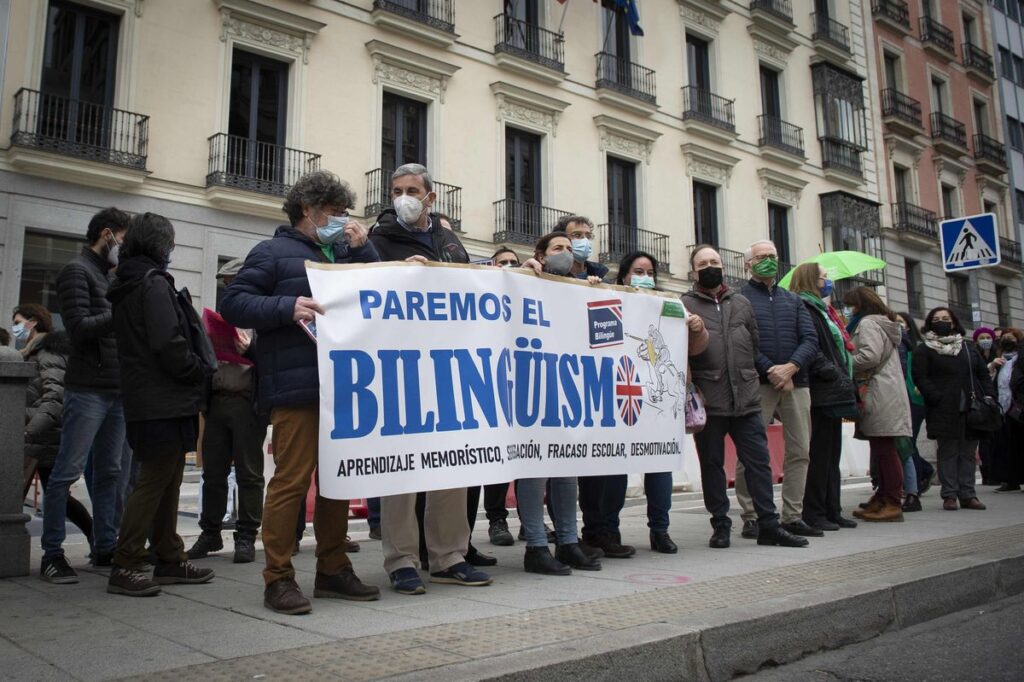 En Madrid se ha hecho más visible el malestar de padres y profesores, preocupados por un modelo que, dicen, está perjudicando al rendimiento académico de sus hijos, aunque no hay estudios concluyentes que avalen esa tesis. Otros académicos críticos señalan que el bilingüismo está estigmatizando a los alumnos que no entran en ese tipo de enseñanza, supuestamente más prestigiosa. Por eso, el sábado pasado CC OO, CGT, STEM Internacional, Escuela Pública de todas y todos, Acción Educativa o la Confapa organizaron una concentración en la puerta de la consejería y el Ministerio de Educación con el lema “Paremos el bilingüismo”. Pero no todos los investigadores piensan igual. Los hay que creen que los críticos se mueven más por interés político contrario al Gobierno popular en Madrid que por la evidencia científica.