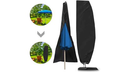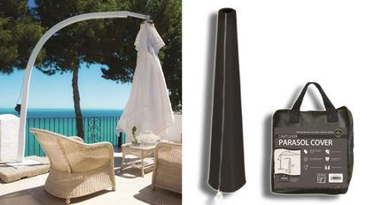 Si eres de los que usa en el jardín un parasol excéntrico (aquellos que disponen de un poste lateral por el que cuelga la sombrilla) y deseas guardarlo de la forma más conveniente, este modelo de funda te interesará. Resistente a los rayos UV y con revestimiento impermeable, resulta muy fácil de ajustar mediante los cordones que equipa. Sus dimensiones son 152 x 216 x 152 centímetros. A la venta en color negro.
