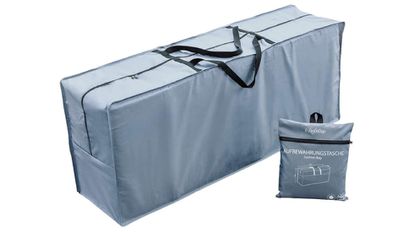 En un color azul claro y con unas dimensiones amplias (125 x 50 x 32 cm), es una buena alternativa para almacenar los cojines de hamacas, tumbonas y sillas cuando dejemos de usarlas, impidiendo su desgaste diario ante las inclemencias del tiempo. Esta bolsa de tela, de tamaño XL, protege ante rayos UV de factor 30 o superiores. Dispone de doble cremallera y un par de asas resistentes. Viene con una práctica funda.