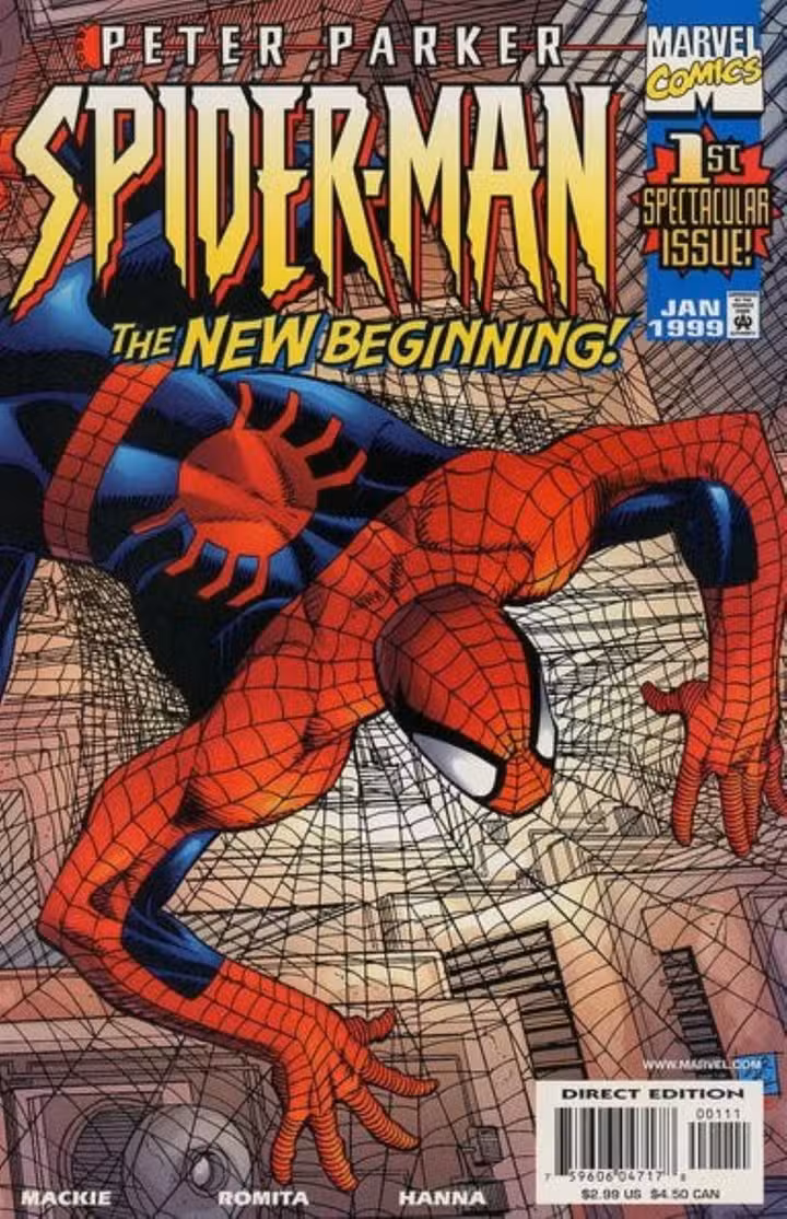 Portada principal de John Romita Jr. y Scott Hanna para Peter Parker: Hombre Araña #1 (1998)