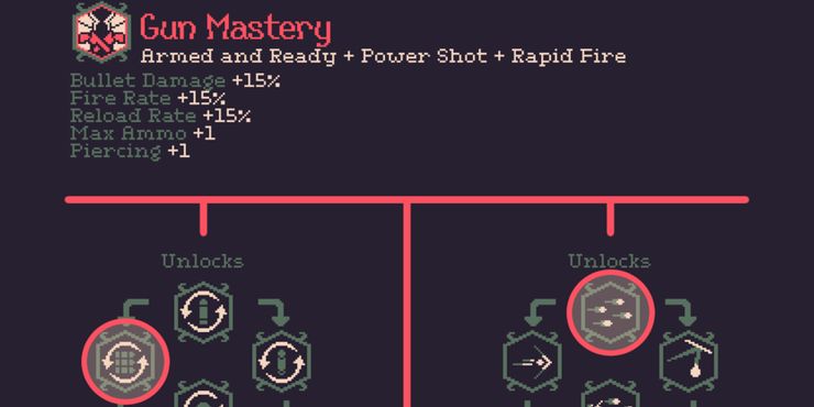 - Dominio de las armas (Armado y Listo + Disparo potente + Disparo rápido): Daño de bala +15 %, Tasa de fuego +15 %, Tasa de recarga +15 %, Munición máxima +1 y Perforación +1