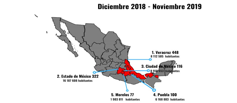 Si bien Veracruz había ocupado el primer lugar durante 12 meses consecutivos, el Estado de México lo desbancó al llegar a esa posición, con 24 casos en el mes de referencia, seguido por Veracruz, 18; Morelos, 10; Tamaulipas, siete; Tabasco y Ciudad de México, cinco.