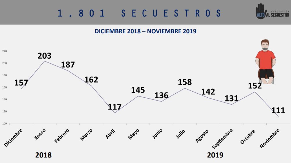 Aunque en noviembre de 2019 se acumularon 111 carpetas de investigación de secuestro, esto representó una baja de 26.9 por ciento en comparación con octubre, cuando sumaron 152.