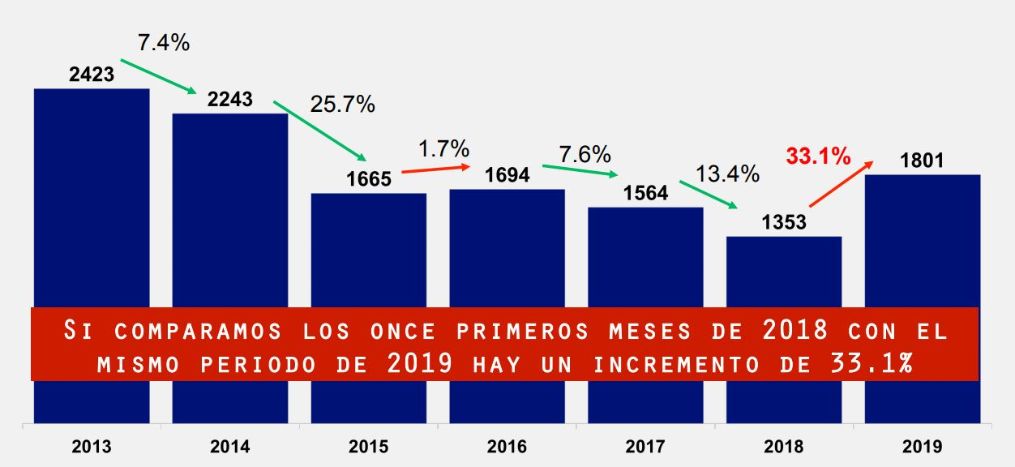 El delito de secuestro se incrementó 33.1 por ciento durante los primeros 11 meses del año frente a igual periodo de 2018, al registrarse mil 801 casos.