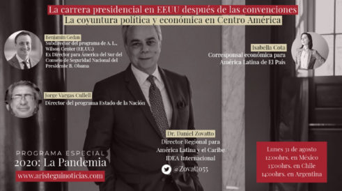 Este lunes, los invitados son Benjamin Gedan, subdirector del programa de América Latina del Wilson Center de EU; Jorge Vargas Cullell, director del programa Estado de la Nación, e Isabella Cota, corresponsal económica para América Latina de El País, quienes abordan el tema “La carrera presidencial en EU después de las convenciones. La coyuntura política y económica en Centroamérica”. Dirigido por Daniel Zovatto, director Fundador del Inter-American Dialogue y del programa latinoamericano del Woodrow Wilson Center, EU.