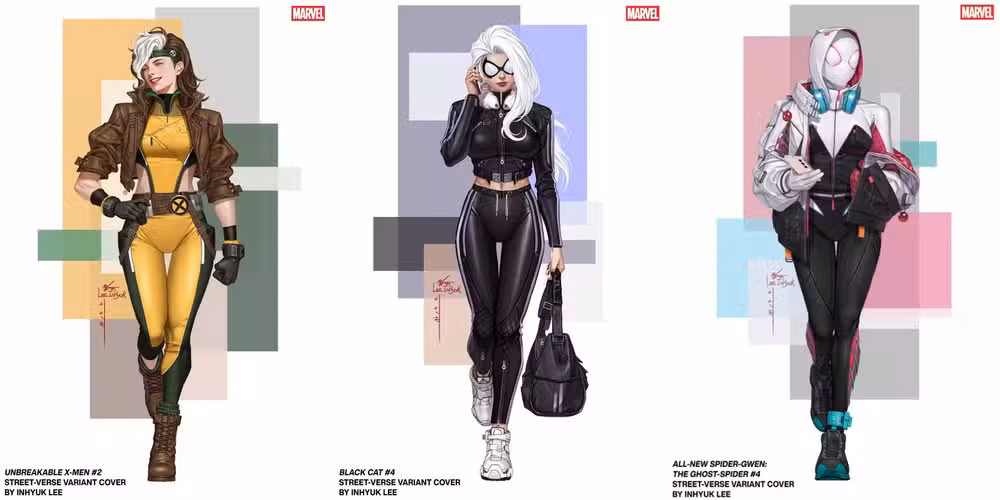 Este año, Marvel lanzó un montón de arte nuevo del Street-Verse de Inhyuk Lee, un universo alternativo teórico donde los uniformes de superhéroes son un lote menos grandilocuente, sino que es una combinación de sus trajes cómicos clásicos y ropa urbana moderna.
