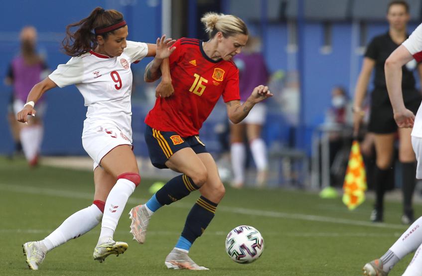 La selección española intentó abrir el juego moviendo el balón por los extremos de Marta Cardona y Mariona Caldentey, aunque los acercamientos no se tradujeron al principio en grandes ocasiones, por lo que hubo que buscar otros recursos como los disparos lejanos o desde la frontal. En uno de ellos, en el descuento del primer tiempo, Aitana Bonmatí marcó con un disparo raso ajustado al palo derecho de la portería de Christensen, que reaccionó tarde y mal ante el disparo de la jugadora del Barça.