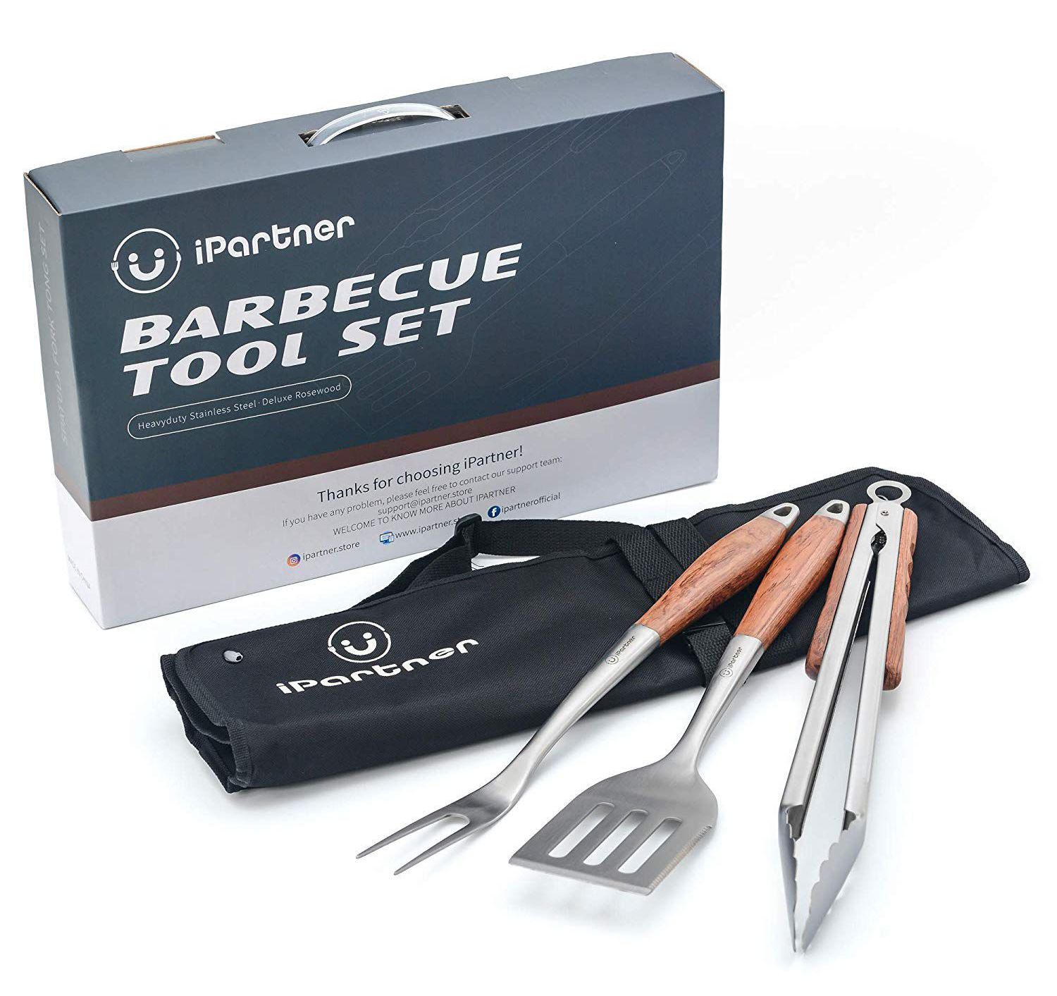 iPartner hizo un juego de herramientas para asar que a papá le encantará. Estas herramientas de alta calidad están hechas de acero inoxidable sólido que no se doblará cuando se manejen cortes grandes de carne o pollos enteros. Las herramientas de 17 a 18 pulgadas de largo, alejadas del calor de sus manos y brazos, cuentan con cómodos mangos de palisandro y el delantal incluido se dobla como un rollo de herramienta.