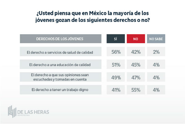 En cuanto a los derechos de los jóvenes en México, más del 50 por ciento de los encuestados consideró que la mayoría de los jóvenes tienen asegurados los derechos a servicios de salud y educación de calidad, mientras que menos de la mitad consideró que tienen asegurados los derechos a que sus opiniones sean tomadas en cuenta y a un trabajo digno.