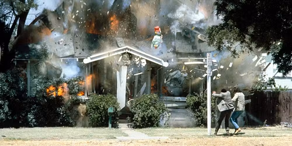 Esto fue antes de que se usara CGI para todo. Si el guión requería que un personaje fuera atropellado por un coche, entonces un especialista sería atropellado por un coche de verdad. Si el guión pedía que un edificio sobre pilotes cayera por la ladera de una montaña, entonces destruirían una casa en la ladera de verdad.