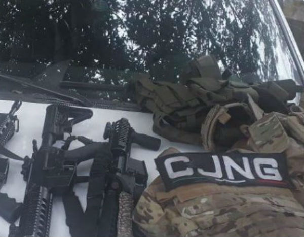 Más tarde, en las inmediaciones de la zona se recuperó una camioneta blanca marca Chevrolet, tipo Suburban, en cuyo interior había tres chalecos antibalas, tres armas largas, seis cargadores abastecidos e indumentaria con las siglas CJNG.
