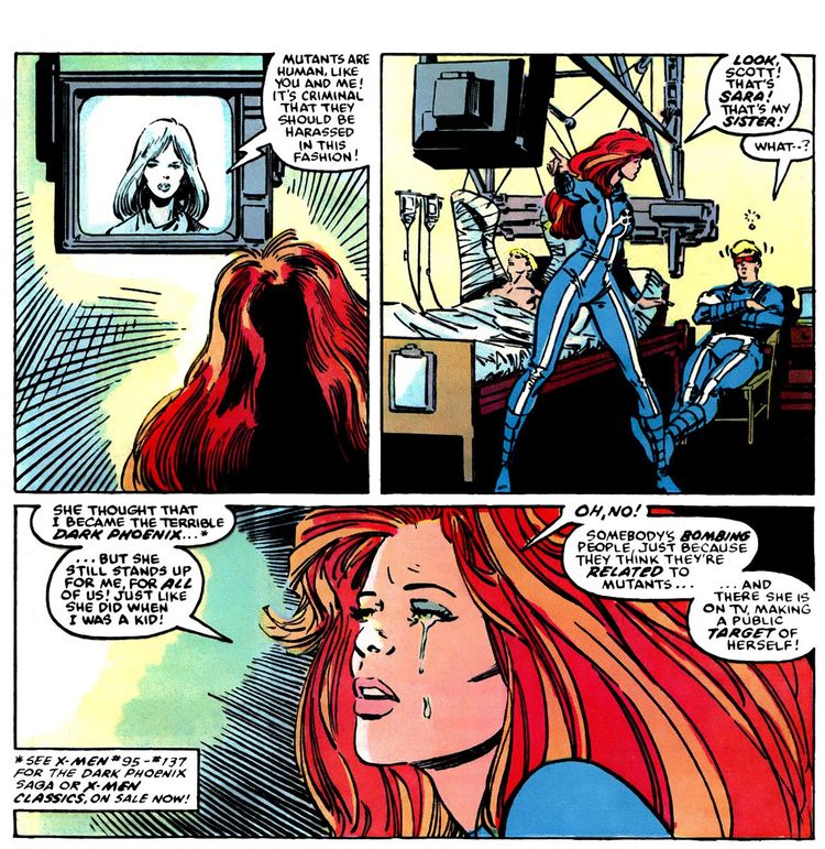 Jean grisla inclusión de X Men Durante la carrera clásica de Chris Claremont casi la reemplaza su hermana olvidada, Sara. Sara Gray, que debutó en 1980, era la hermana humana de Jean a quien se le insinuaba que tenía poderes mutantes latentes que aún no habían surgido. Antes de que esos poderes puedan manifestarse, fanáticos antimutantes la matan por ser portavoz de los derechos de los mutantes en apoyo de su hermana.