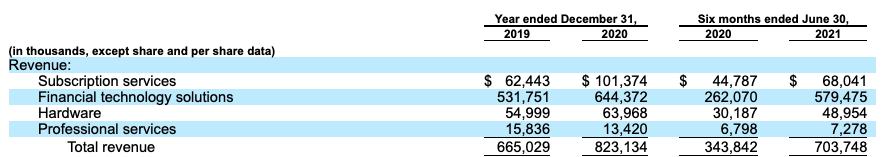 Aquí está el desempeño de primera línea de Toast para 2019, 2020 y la primera mitad de 2020 y 2021, tomado de su presentación S-1: