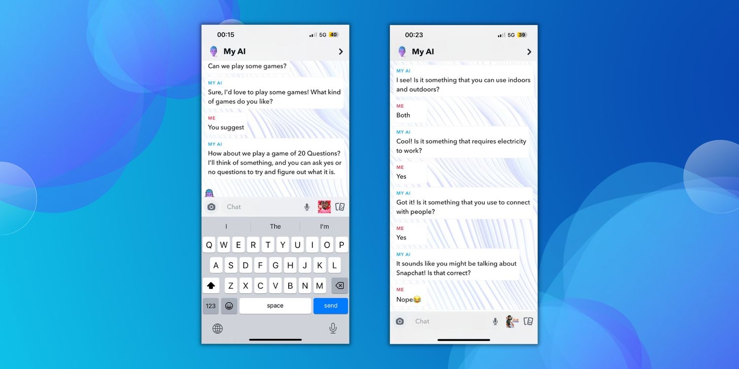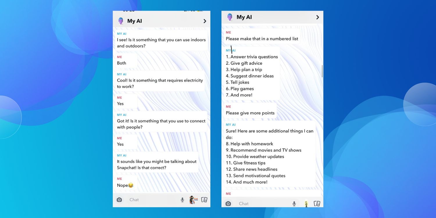 Mi IA aparece en la parte superior de la sección de chat en Snapchat. Los usuarios pueden interactuar con el chatbot como si estuvieran hablando con un amigo, y responde constantemente. Al enviar el chatbot “Eyresponde con “¡Ey! Cómo estáse intenta iniciar una conversación divertida. El tono amistoso también es visible en otras respuestas. Curiosamente, los usuarios pueden incluso jugar juegos de trivia con el chatbot, como 20 preguntas. comenzó a jugar el juego con el chatbot e hizo que el juego pareciera divertido. Sin embargo, durante el juego, el chatbot perdió la noción de las cosas por alguna razón y tuvo que recordárselo.