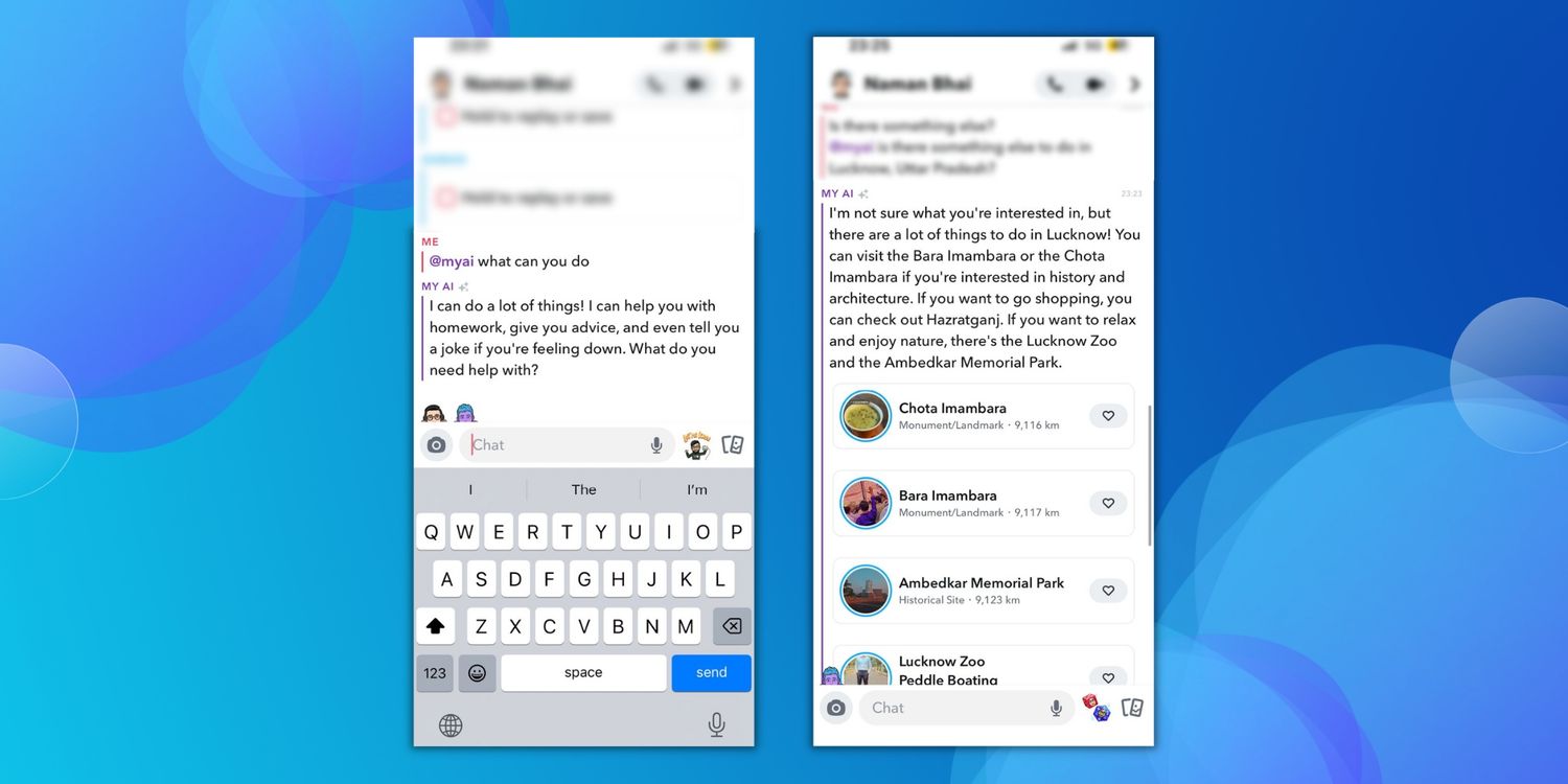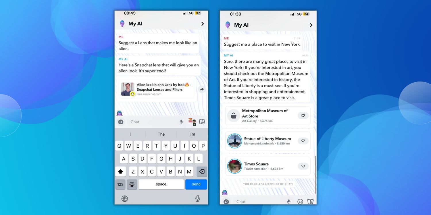 Los usuarios pueden pedirle a My AI sugerencias sobre actividades locales. Usando Snap Map, el chatbot presenta recomendaciones de lugares. En general, Snap Map muestra los puntos de acceso que otros Snapchatters visitan con bastante frecuencia; por lo tanto, existe una buena posibilidad de que las recomendaciones de lugares se basen en estos datos. Además, los usuarios pueden incluso pedirle a My AI sugerencias relacionadas con las lentes de Snapchat, como una lente para desear a alguien en su cumpleaños o una lente que hace que el usuario parezca un extraterrestre.
