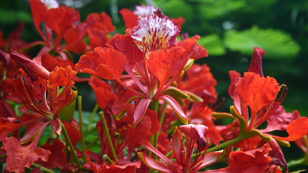 - De mayo a septiembre es su época de florecimiento: destaca por ser un espectáculo por su belleza, donde cada flor llega a tener cinco pétalos de color naranja/rojizo o rojo. Uno de los pétalos siempre va a ser de mayor tamaño que el resto y tendrá marcas blancas y amarillas.