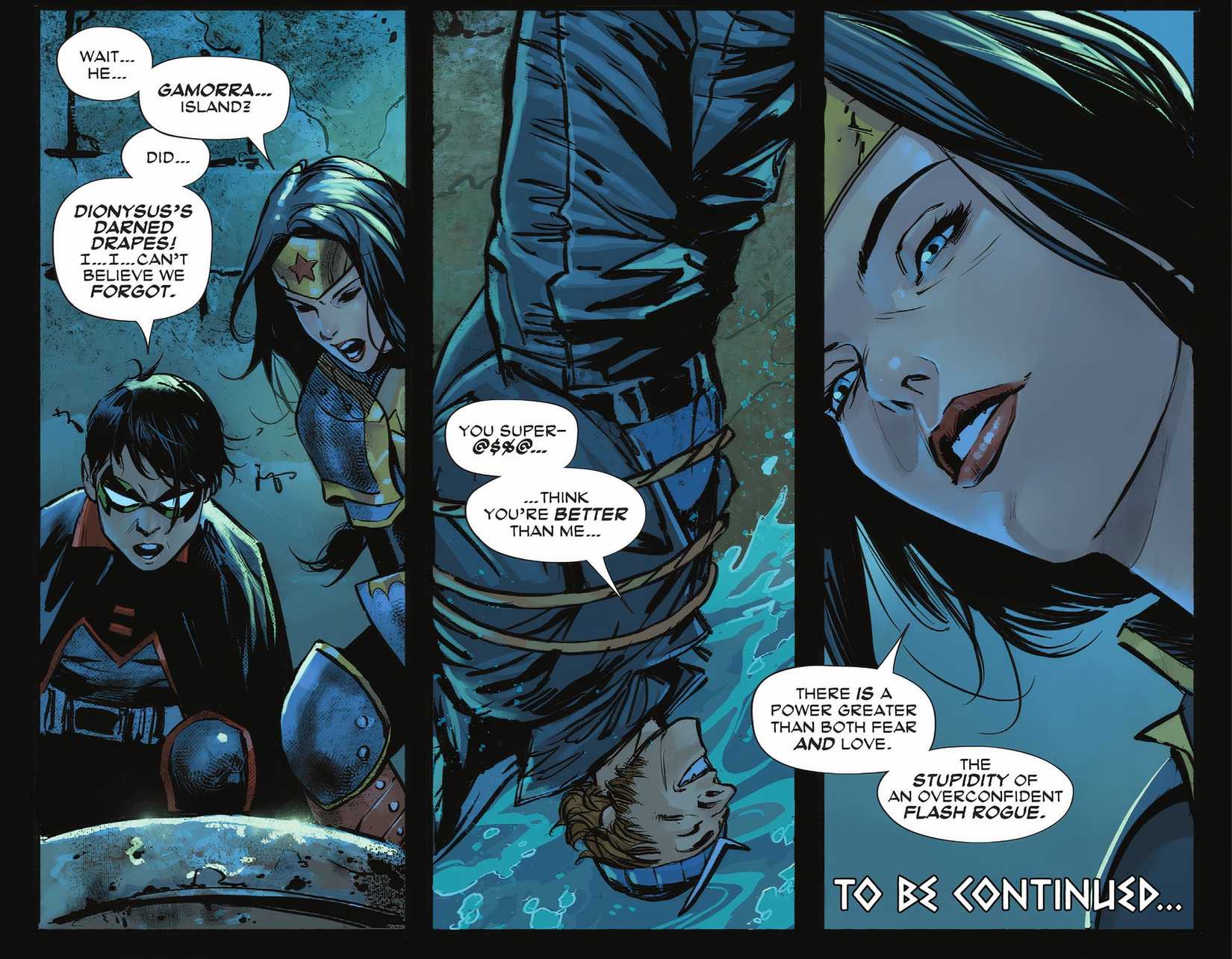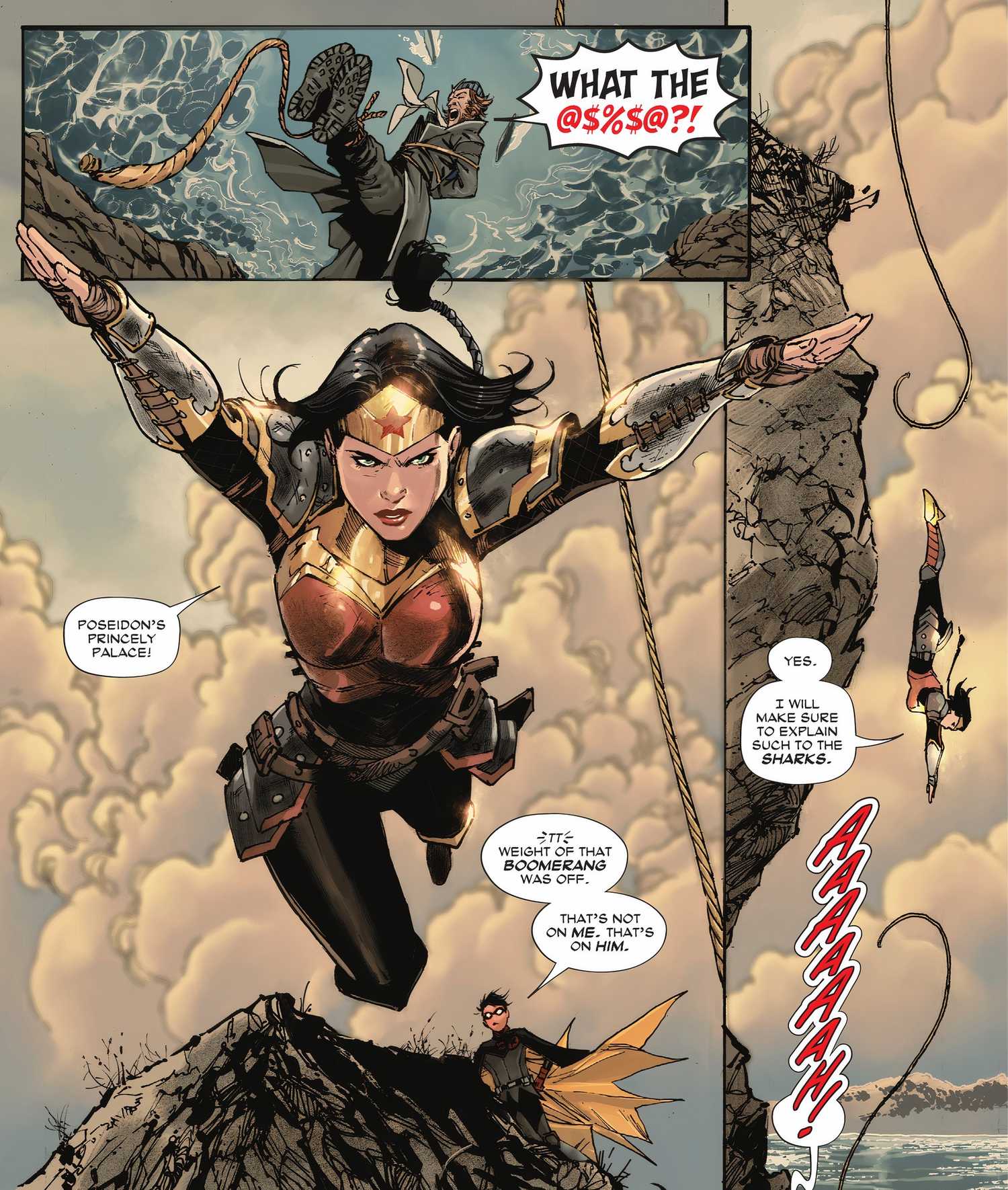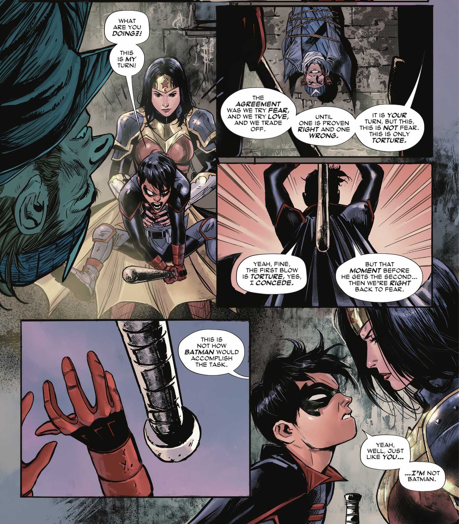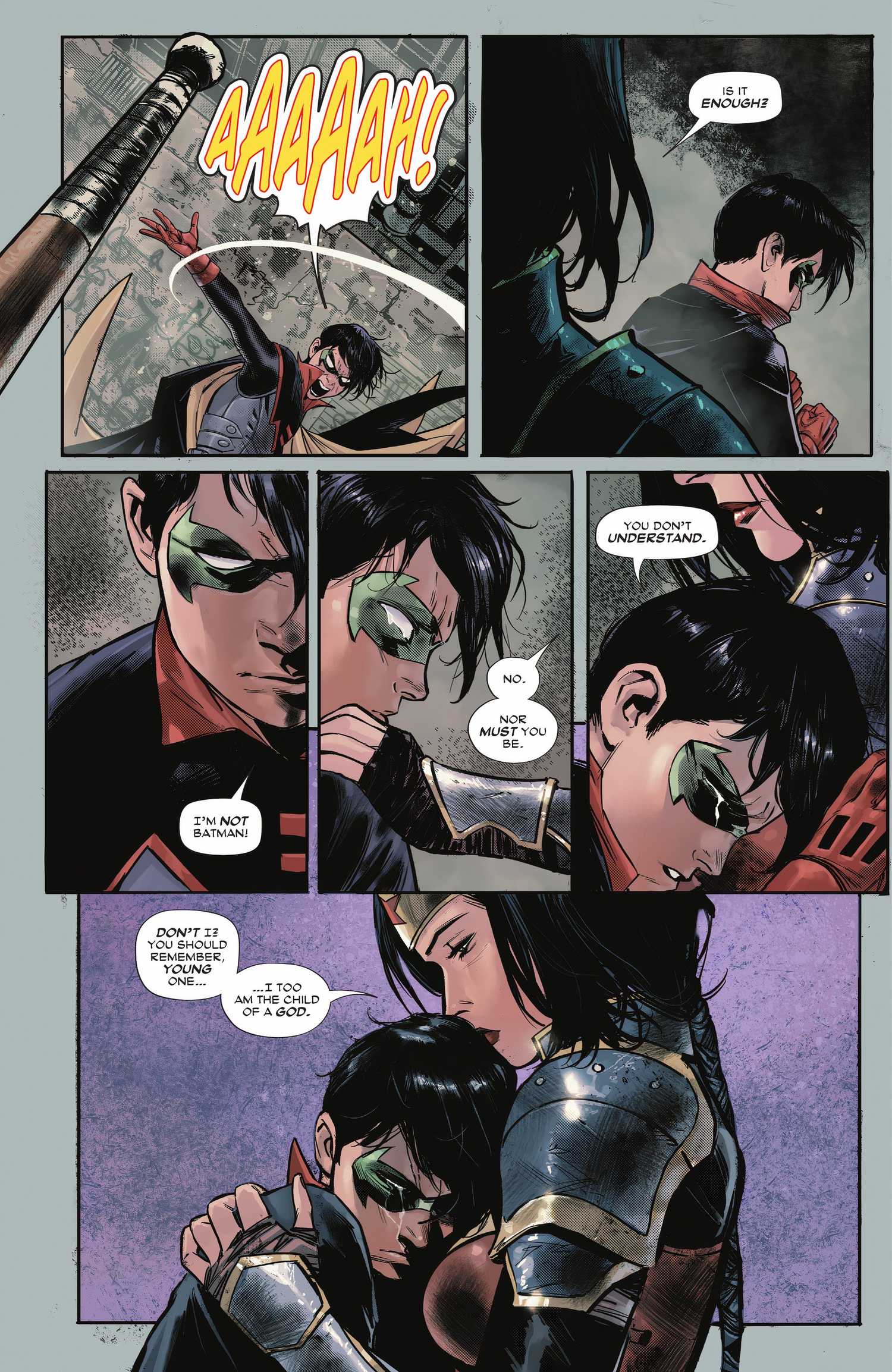 Mujer Maravilla El número 12 ha estado haciendo ruido en Tumblr y otras plataformas de redes sociales gracias a un momento destacado que ha derretido los corazones de los fanáticos de Damian Wayne. Después de varios intentos fallidos de lograr que el Capitán Boomerang revele la ubicación de la prisión secreta de Waller, Damian se frustra cada vez más y se prepara para usar la fuerza. Cuando Wonder Woman lo detiene, explicándole que Batman no querría que usara la tortura, Damian se derrumba y señala que él no es su padre. El intento de Diana de consolarlo conduce a su comentario de que ella no entiende, lo que la impulsa a responder: —¿No es así? Deberías recordarlo, jovencita… Yo también soy hija de un dios.