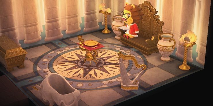 Con un rostro perpetuamente enojado y túnicas regias, el gruñón aldeano león Elvis es ciertamente una figura intimidante, un efecto que solo se ve reforzado por la decoración real de su hogar. Con una casa con un sofá en forma de trono y lujos como un arpa ornamentada y papel tapiz de columna de mármol, la estética real de Elvis grita a un tipo rico y malvado.