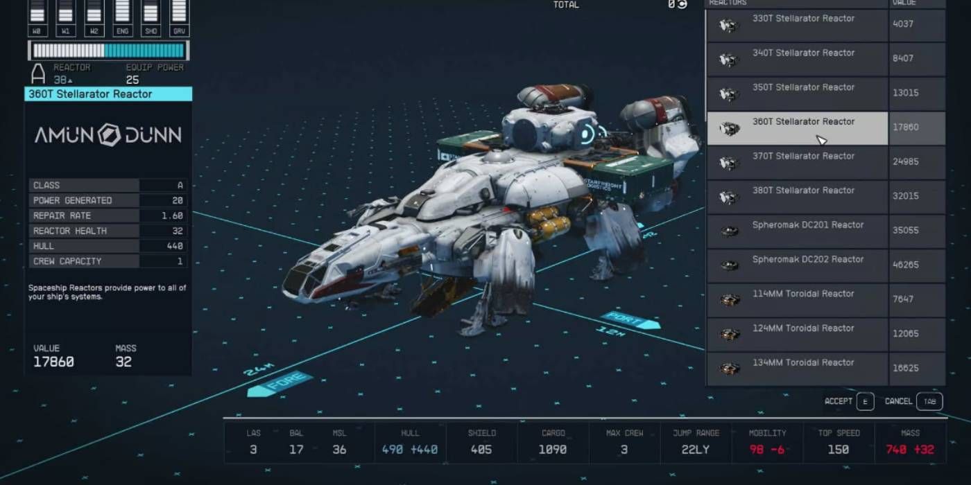 Reactores clase A como el Estelarador 360T funcionan principalmente en barcos más pequeños con menos generación de energía o valores de casco, pero son mucho más livianos. Este generador en particular puede ser excelente para las primeras misionesproporcionando estadísticas superiores al promedio para los barcos a los que puede acceder al comienzo de su viaje en campo estelar. Además, este reactor no requiere que tu personaje tenga un rango de habilidad para utilizar la pieza.