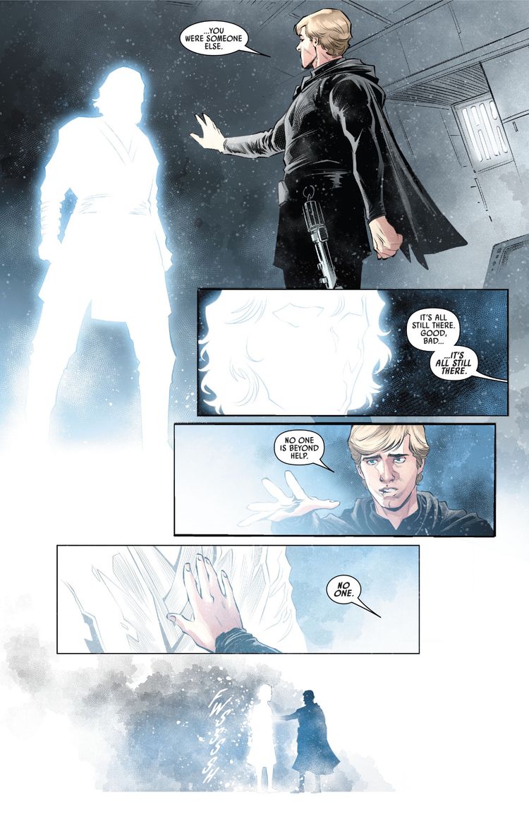 En el nuevo Guerra de las Galaxias #43 de Charles Soule, Steven Cummings y Jethro Morales ambientado entre El imperio Contraataca y El regreso del Jedi, Luke Skywalker está intentando curar un cristal kyber corrompido por un antiguo Sith. Este proceso espiritual da como resultado una visión clave de la Fuerza que motiva a Luke a enfrentar todo el dolor de los Sith que estaba atado a este cristal. Sin embargo, su propio dolor y sufrimiento emergen en la forma de su padre Darth Vader, aunque Skywalker finalmente ve al hombre debajo de toda la oscuridad: