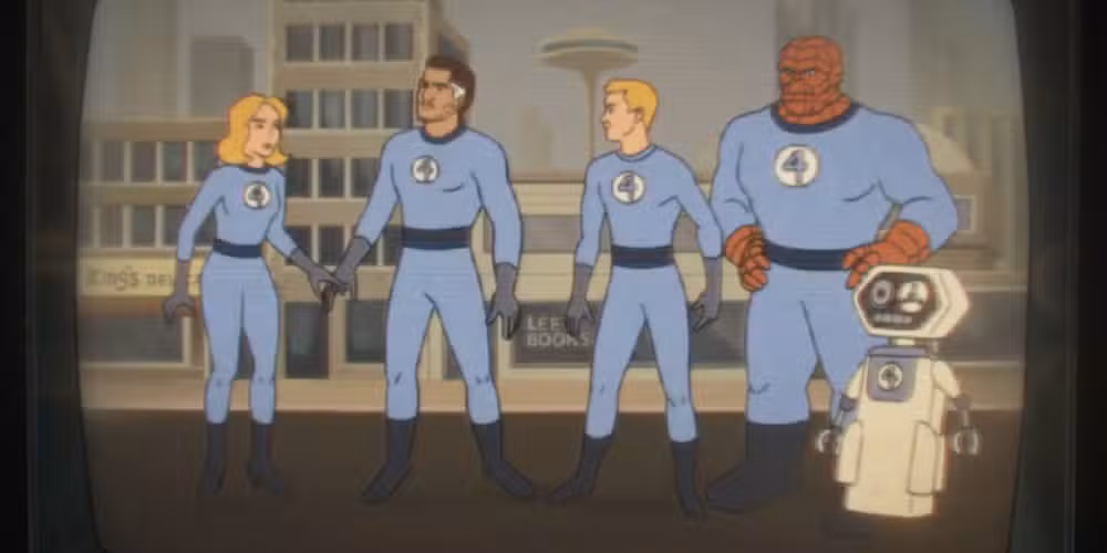 Cinco de los villanos más antiguos y peligrosos de los Cuatro Fantásticos se mencionan en Pinitossolo se muestra en su totalidad en la escena de los créditos finales que representa el programa animado basado en los héroes de la película.