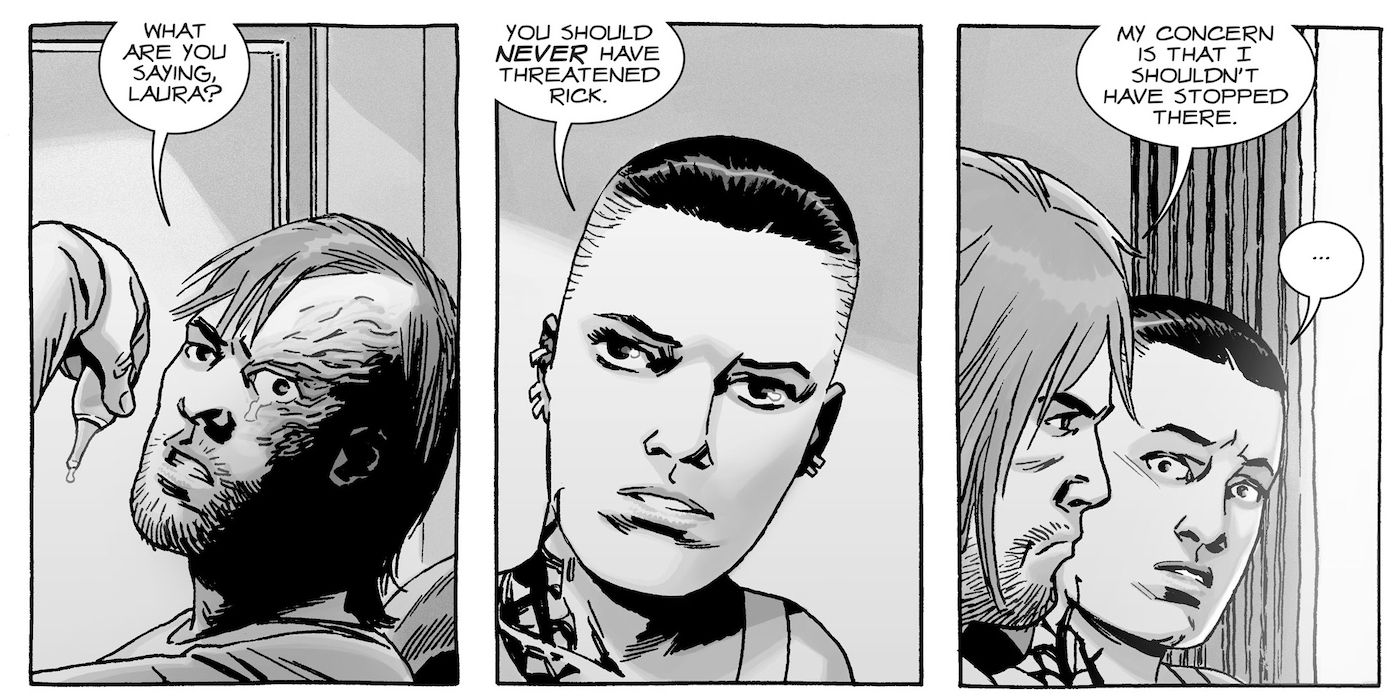 No hay duda de que la vida en un apocalipsis zombi es dura, pero para Laura se vuelve mucho más tolerable después de dejar a los Salvadores. Encuentra un trabajo sólido, estable y enriquecedor como parte de la Milicia de Rick y, a nivel personal, encontró compañía y amor con un Dwight reformado. Es todo lo que ella podría pedir en circunstancias tan terribles. Pero esa vida se derrumba cuando Rick dispara y mata a Dwight después de que apunta con un arma a Pamela Milton. En ese instante, Rick se convierte en enemigo de Laura, y ella debe sentir una punzada de alegría al enterarse de que lo asesinan. Pero su muerte no acaba con el dolor, la angustia y el odio que le tiene. Esto solo empeora por el hecho de que en vida, y especialmente después de la muerte, Rick es celebrado como un héroe que no puede hacer nada malo. Posteriormente, en lugar de lograr cierto nivel de cierre sobre la muerte de Dwight, ella no puede escapar de la mención de su asesino ni de la “bondad” de su asesino. Es tan debilitante que Laura recurre a una especie de autoexilio en el que evita las comunidades y las multitudes para vivir una vida más dura y aislada al margen de la sociedad.