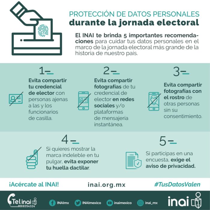 El Instituto Nacional de Transparencia, Acceso a la Información y Protección de Datos Personales (INAI) emitió las siguientes recomendaciones a la población para cuidar sus datos personales en la jornada electoral del 6 de junio: