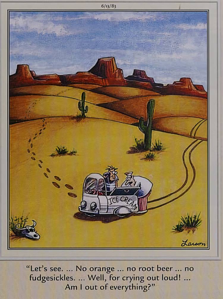 Este clásico Lado lejano La caricatura fusiona el frecuente tropo “perdido en el desierto” de Gary Larson y su gag de helado más usado con escasamente, uniendo “desierto” y “postre” de manera inesperadamente brillante. En este cómic, Un hombre engañado deambulando por el cálido y árido desierto, milagrosamente, tropieza con un vendedor de helados, solo para encontrar, para ambos consternaciones, que él es “de todo“