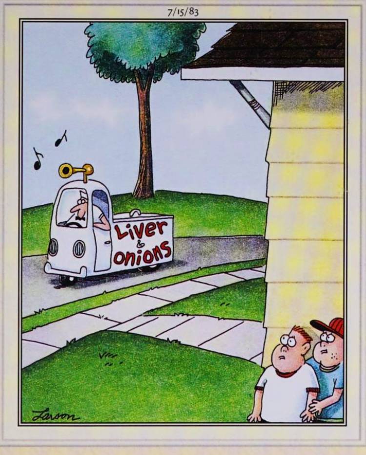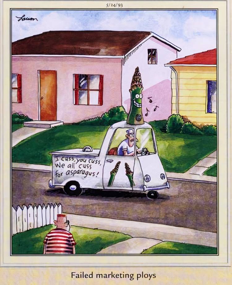 Aquí, Gary Larson posiblemente logre el pináculo de sus chistes de camiones de helados de carrera posterior; En este caso, es el “camión de espárragos”, lo que navega por el vecindario con el eslogan “¡CUSS, MUCHA, ¡TODOS CUSS POR ESPARAGUS!“