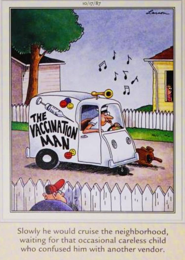 Aquí, Gary Larson ejecuta la misma premisa que la entrada anterior, excepto esta vez de manera aún más extraña, representando “el hombre de la vacunación“Conducir, buscar, como nos dice la leyenda”,para ese niño descuidado ocasional que lo confundió con otro vendedor“